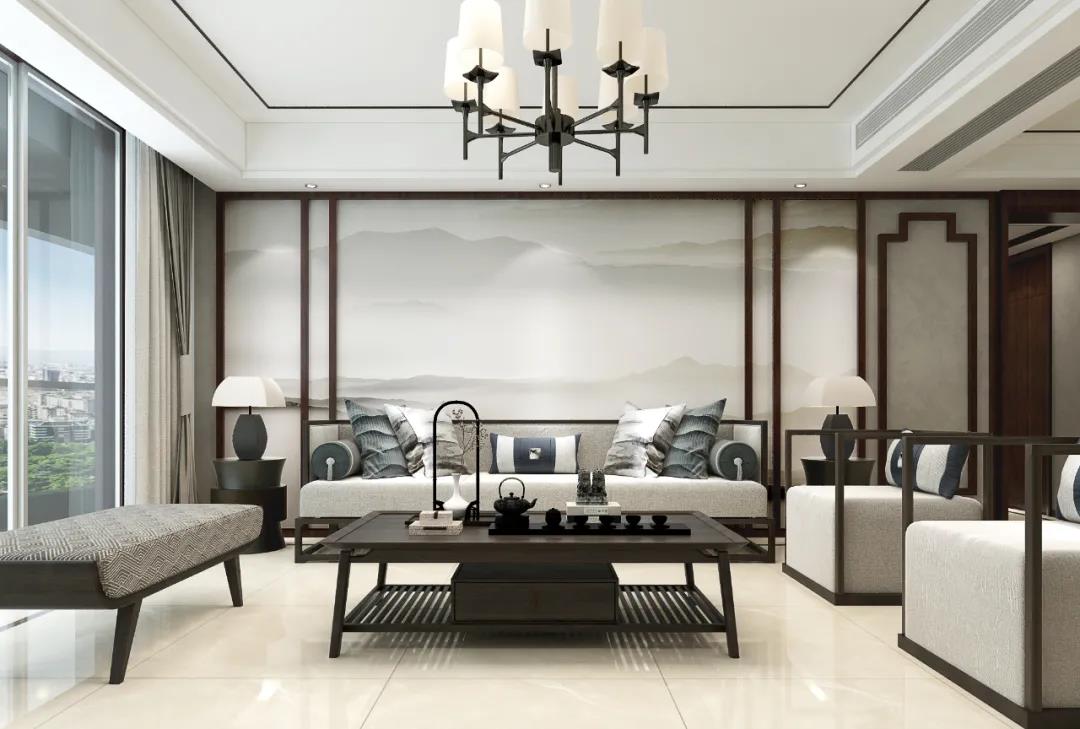 客廳設計上采用濃厚的新中式元素,不論是墻面的山水畫、還是線條勾勒如窗欞的花紋裝飾,無一不透露著中式獨有的詩畫韻味。電視墻采用大理石花紋,靈動自然、奢華尊貴,再加以盤虬盆栽,打造出極富古典氣息的空間氣質。