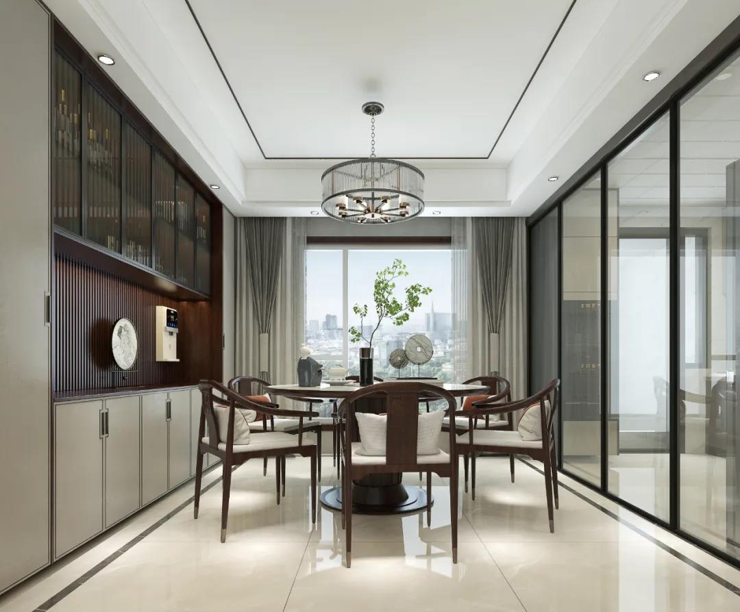 餐邊柜的設計,利于物品的擺放和存取。上方柜體門透明,既能做收納之用,也能作酒柜展示之用。與整體風格相符合的圓形餐桌,再次點名新中式的主題,更表達了傳統文化中對“團圓”的期待。