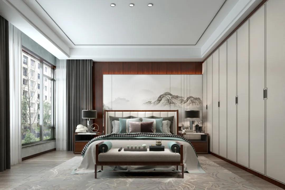 主臥床頭山水畫再次點明新中式主題,深棕色墻面與白色墻面中和,厚重也不失飄逸。無主燈設計讓室內光線更加柔和,主人在此休息睡眠體驗更好。衛生間做干濕分離,便于保持清潔,淋浴室做防滑設計,小細節很重要。
