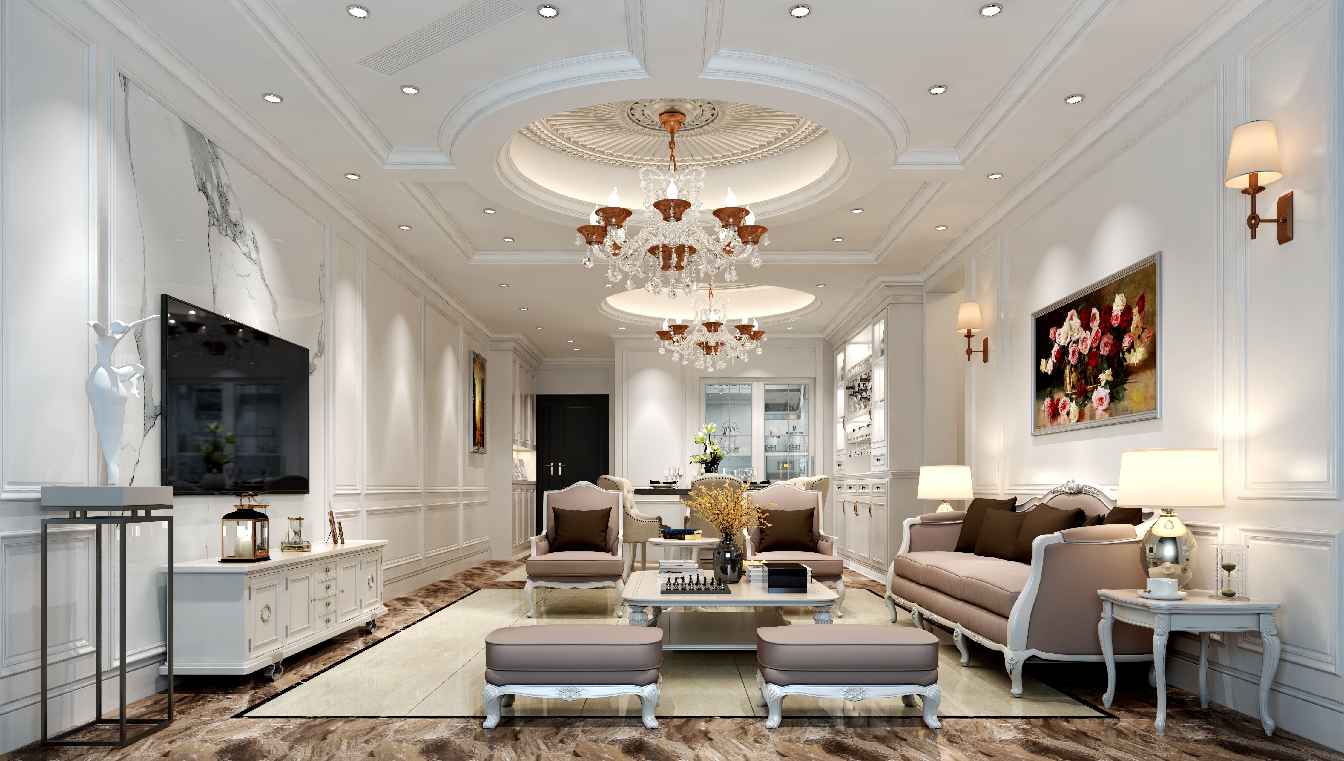 ● 戶型面積:110㎡ ● 設計風格:現代美式 ● 整體預算:30萬 效果欣賞 客廳區域 主臥 女兒房