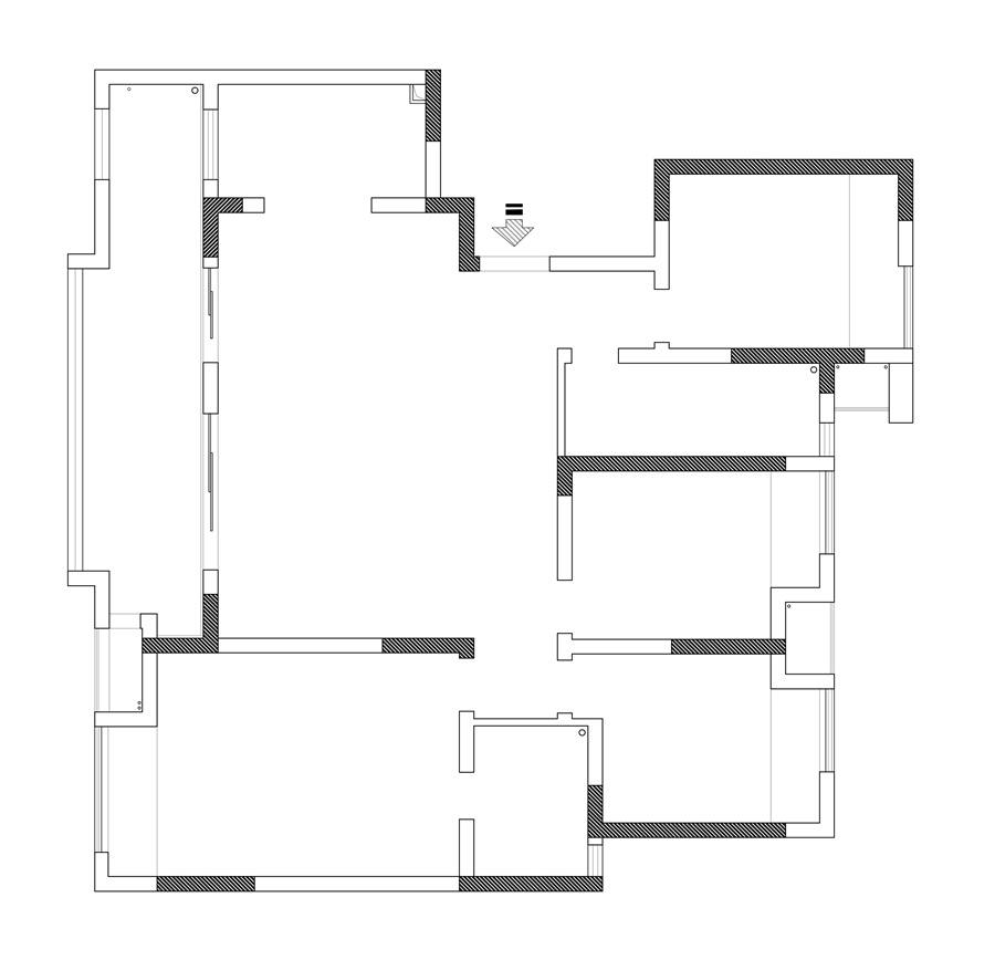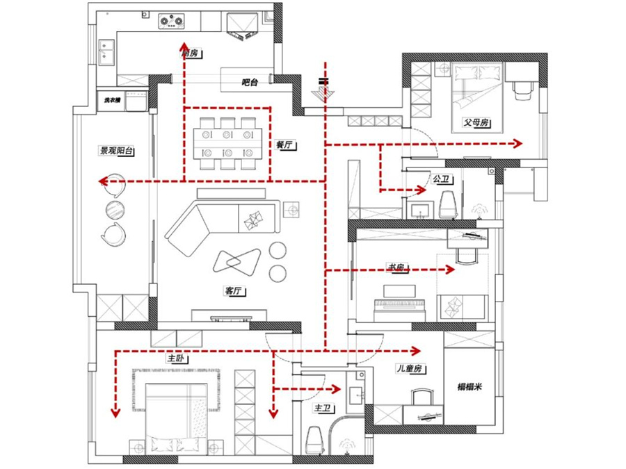 原始結構圖 平面布置動線圖 設計平面布置圖 玄關放置換鞋凳,家中老人進出換鞋更方便。一旁的小吧臺能很好地起到隔斷作用,將父母房和衛生間隔開,使精簡功能分區更明確。吧臺