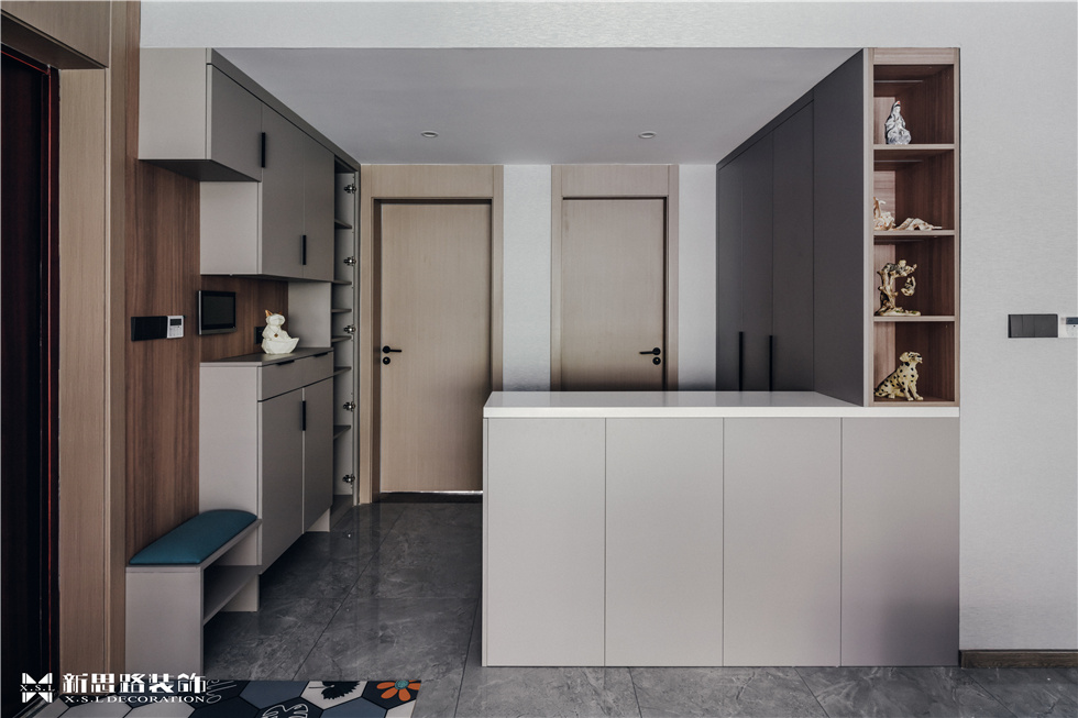 玄關放置換鞋凳,家中老人進出換鞋更方便。一旁的小吧臺能很好地起到隔斷作用,將父母房和衛生間隔開,使精簡功能分區更明確。吧臺上可放置物品,下方的柜體也能增加儲物空間,十分實用。