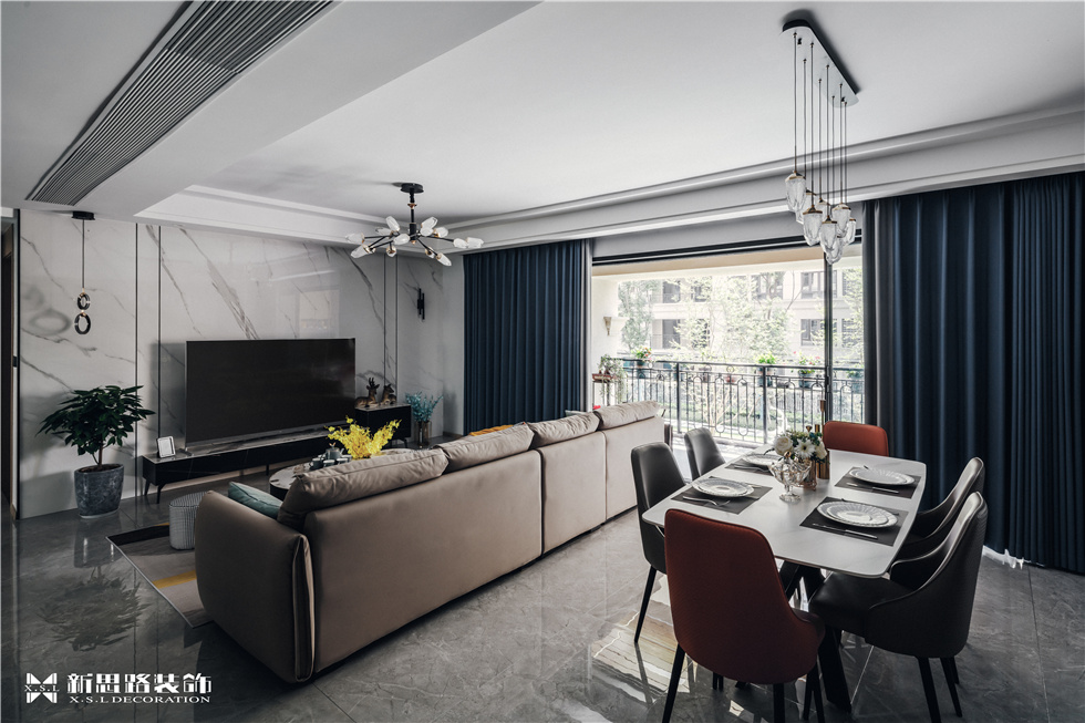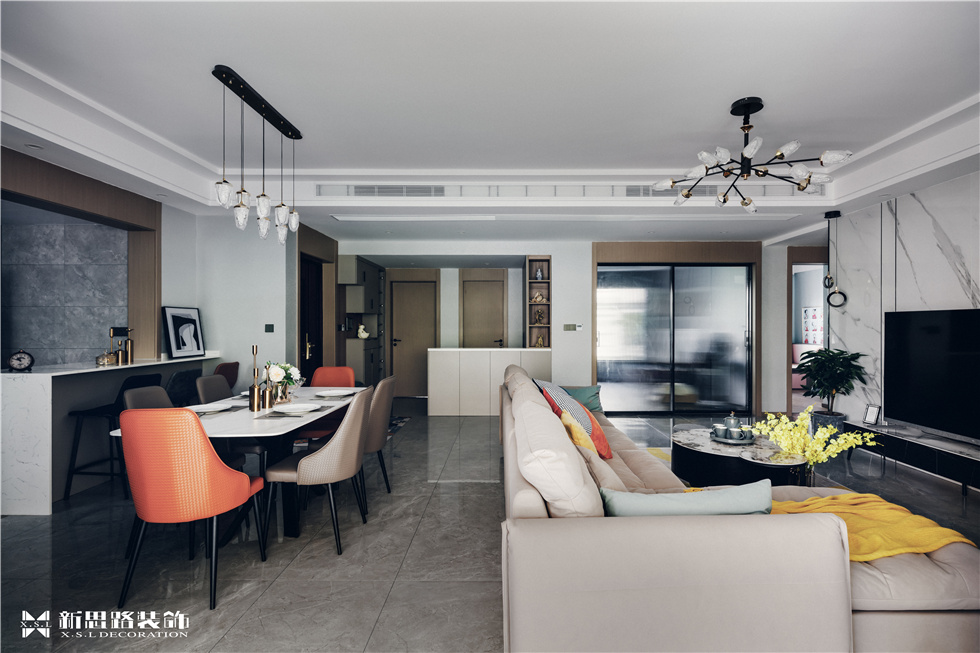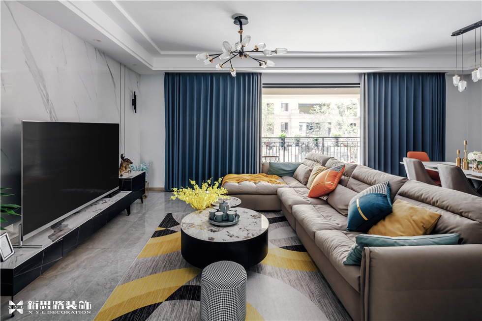 客廳的色彩搭配上選擇撞色設計,淺色系的白、淺棕、灰,深色系的黑、深棕、藏青,還有冷色系和姜黃、深橘色等暖色系的相碰,為空間增添了不少活力和生機。大理石紋理的電視墻與茶幾、電視柜在低調中又透出一絲奢華之感,沙發選用科技布材質,更加柔軟舒適,忙碌一天回到家后于此小坐,能得到更好的休息與放松