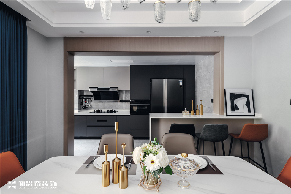 餐桌選用六人桌的款式,方中有圓,減輕空間中的棱角感。橙、灰、白拼色的搭配,現代感十足。吊燈造型如花苞又如水晶礦石,簡約又有優雅感。獨立的休閑吧臺能起到劃分開放式廚房與客廳空間的作用,其不僅是吧臺,也能作為西餐、冷餐料理臺使用,功能性強。閑來在此品咖啡,小坐娛樂,不失舒適和放松,頗有情調