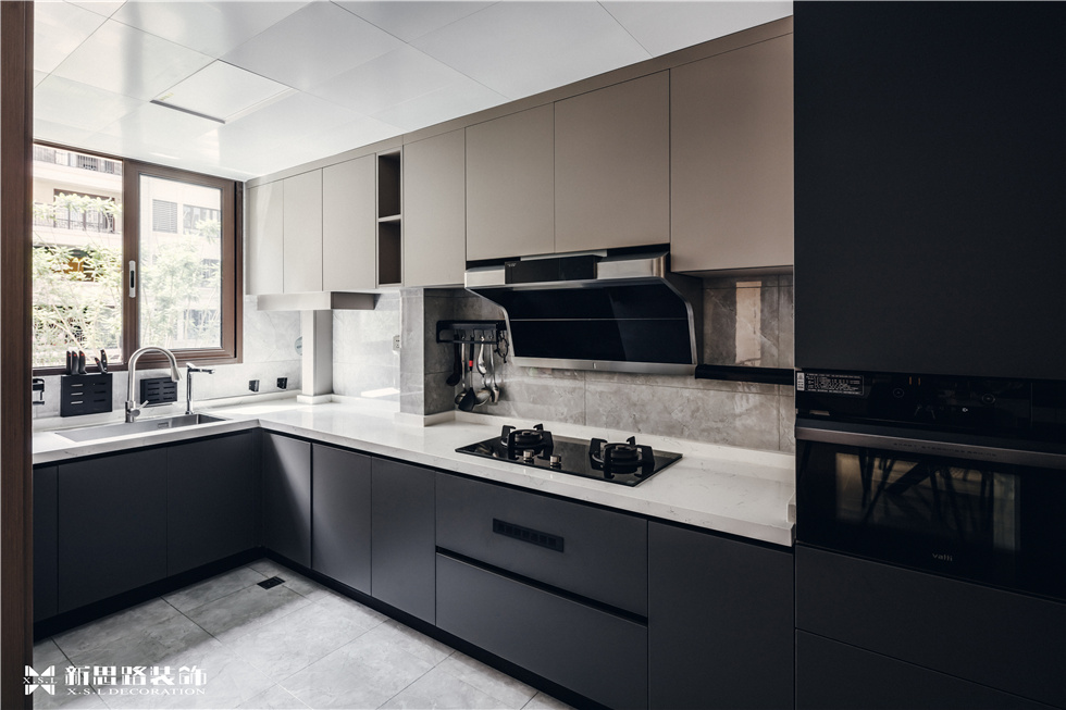 廚房柜體顏色使用深灰和卡其色,造型方正、線條感強,點明現代風格的主題。操作臺沿墻面排布,灶臺、料理臺、水盆等區域劃分明確,便于整理和打掃。配備超強吸力的油煙機,即使是開放式廚房也不用擔心爆炒等猛火烹飪帶來的油煙。