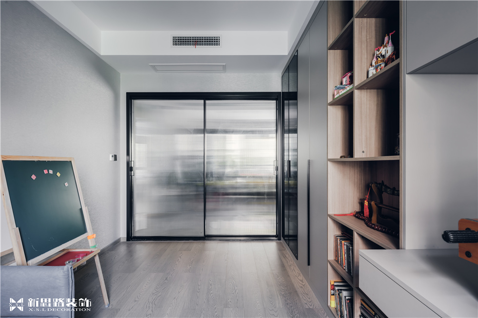 靠近客廳的房間改造成為獨立多功能房,打開門后即可和客廳連為一體,起到間接為客廳分擔部分功能的作用。既能作為休閑娛樂、客人下榻的場所,也能作為書房使用,滿足了客戶想擁有一個安靜閱讀、工作和學習環境的需求。超大的書柜作為書籍、玩具、擺件的收納之處非常不錯,書桌臨近窗戶,優秀采光更加護眼。