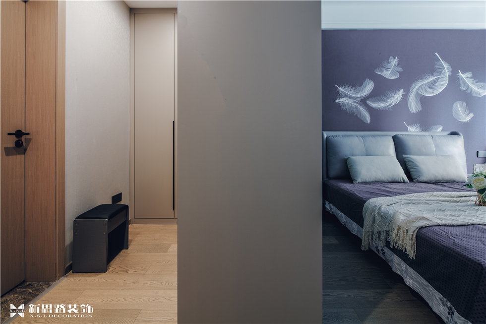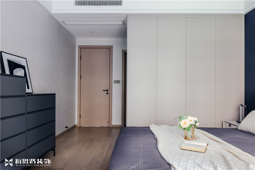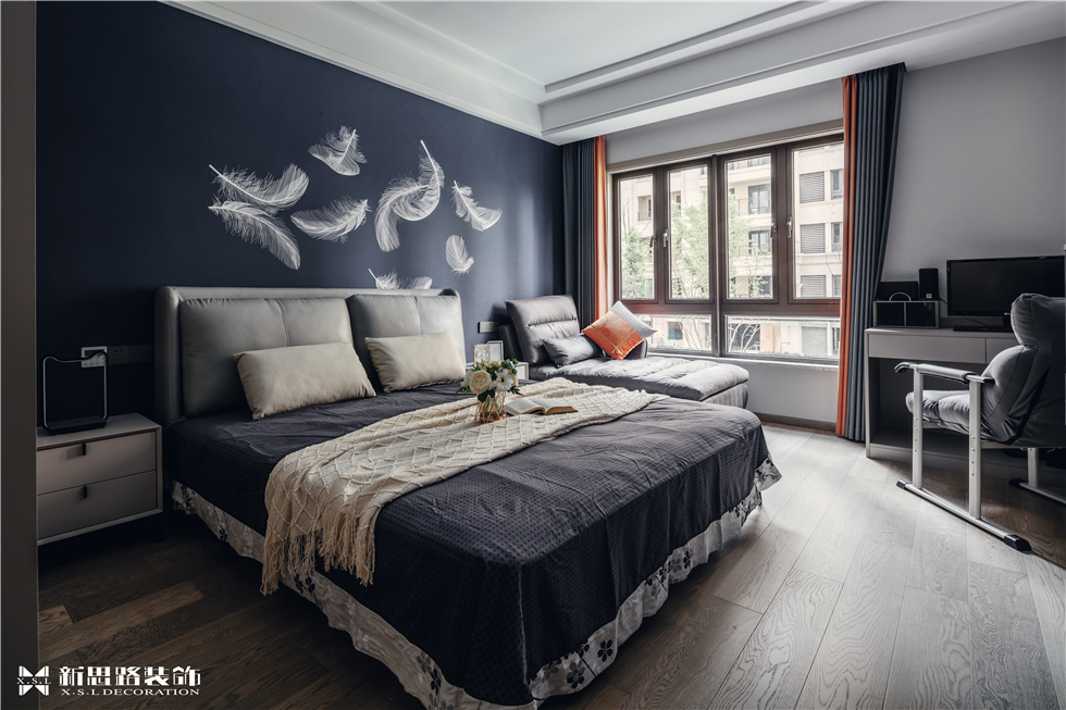 主臥由臥室、衣帽間和主衛三個部分構成,超多柜體的設計讓收納不再成為煩惱。整體選擇盡量簡約和減少配飾的設計思路,力求減輕累贅和繁復感。在配色上,選擇了藏青色和白色的搭配,更深沉穩重、有格調,再點綴一抹橙色,空間氣氛不會顯得沉悶。臨近窗戶的位置增添一張沙發,可坐可躺,是個放松和休息的不錯選擇。