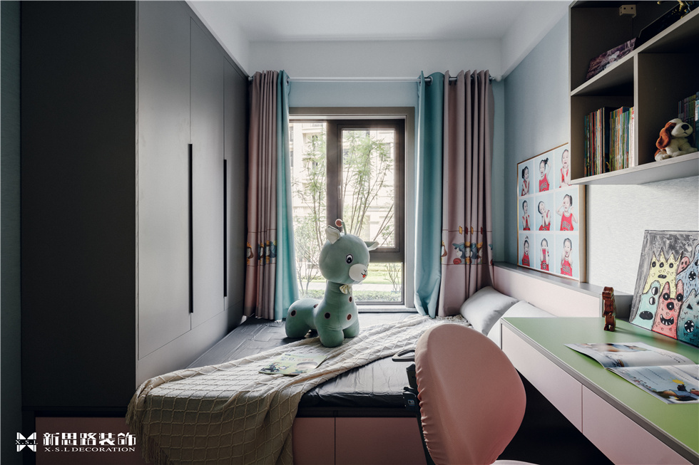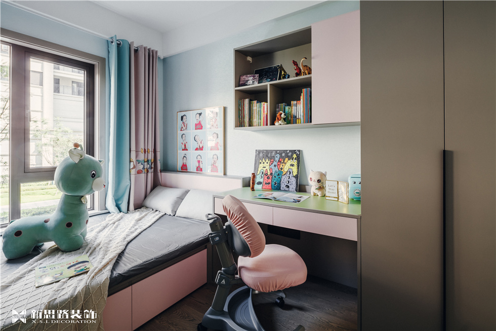 兒童房色調以小女孩喜歡的藍、粉為主,配以各種卡通裝飾,童趣活潑。床鋪做成了榻榻米的形式,滿足孩子成長時不斷增加的收納需求。獨立的懸掛書柜,不僅能放下孩子喜歡的圖書,小女孩珍藏的小恐龍等擺件和玩偶也有了自己的“住處”。