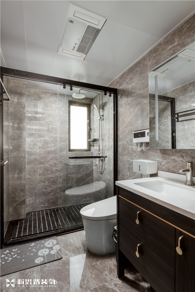 衛生間整體使用深卡其色的大理石紋理瓷磚,低調奢華。干濕分離的設計很好地隔絕了沐浴會帶來的水汽對柜體的影響,減輕衛生間積水和潮濕情況。淋浴間的防滑設計和馬桶旁的扶手都是為老人貼心準備的,方便老人洗漱,更加安全,不易滑倒。