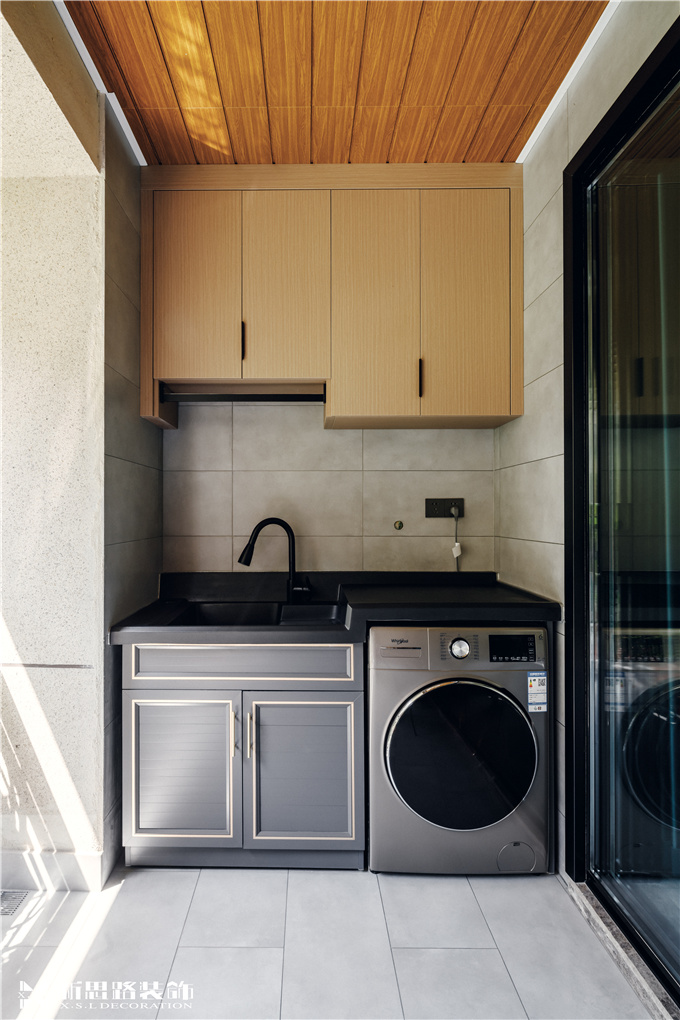 陽臺功能為休閑、洗衣和晾曬區。大面積向陽晾曬區滿足一家五口的需求,獨立于衛生間的洗衣區配備洗衣槽,更符合老人的生活習慣。上方衣架收納桿實用又方便,即取即用。