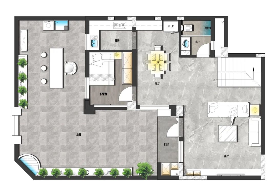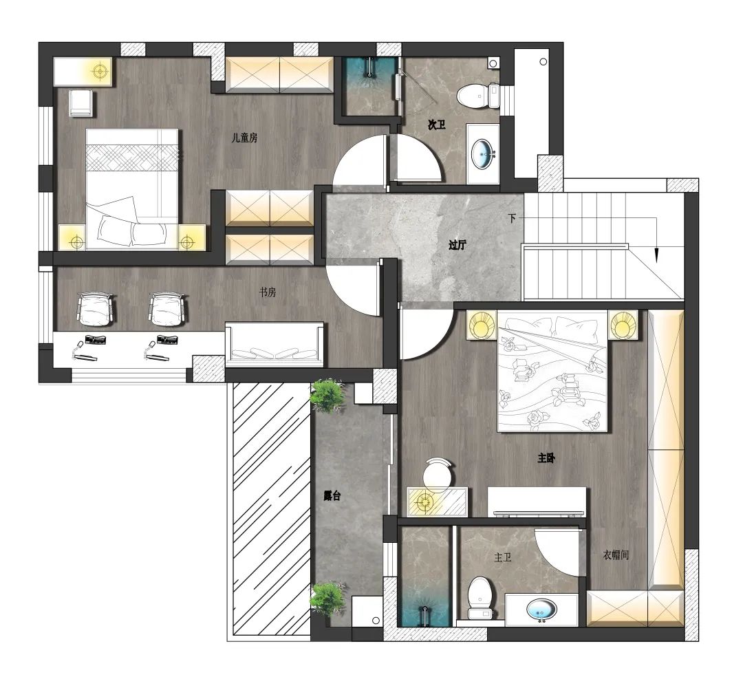 為滿足屋主三世同堂的需求,設計師選擇現(xiàn)澆二樓作為主臥的使用,整面墻的衣柜滿足儲存需求,并按照屋主家里老人居住的需求,將1樓單獨做出老人房的空間,現(xiàn)代風格致力打造三世同堂的理想家居。
