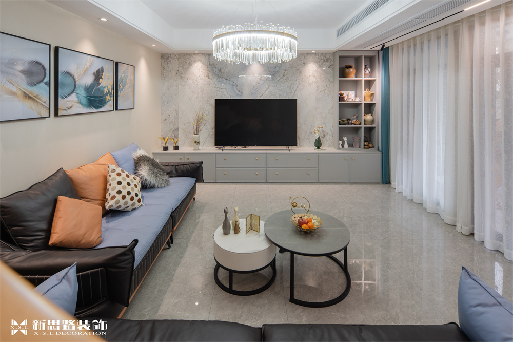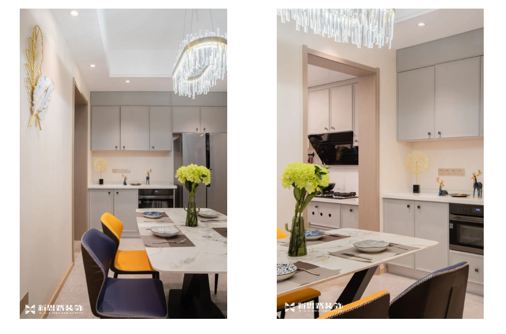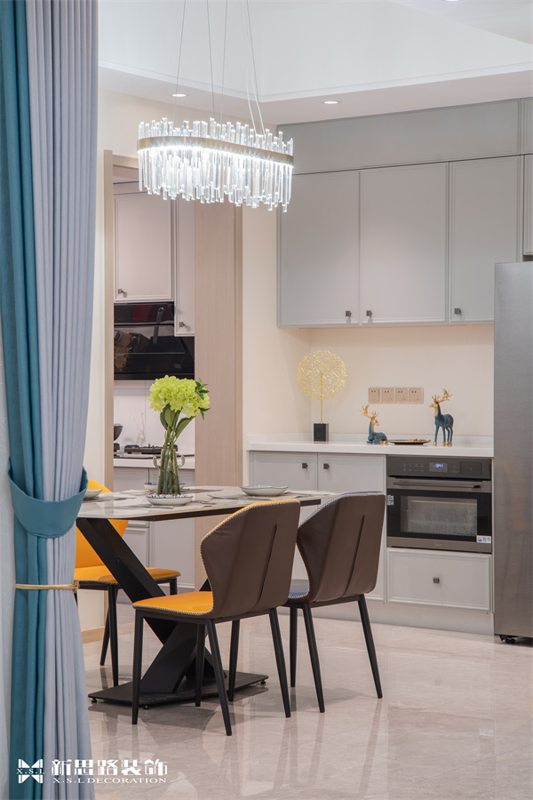 餐廳延續(xù)了整體空間的主色調(diào)和線條美感,大理石餐桌蓄意帶來一種自然的藝術(shù)氛圍,在原有的沉穩(wěn)柔和中注入新的活力,素色的皮革餐椅打造出舒適的觸感。讓人全情地投入生活,熱愛生活中一食一飲的歡愉。客廳與餐廳開放式相連,整體色調(diào)素雅大氣,將抽象的自然意象,化為簡約的視覺符號;背景墻面的藝術(shù)裝置,擁有琥珀色的溫暖氣息,帶來多維度的層次感;樸素、自然、溫暖,設計師以現(xiàn)代藝術(shù)演變空間圖案,讓人不經(jīng)意間,總能感受到時間的沉淀。
