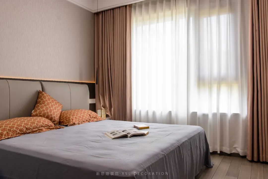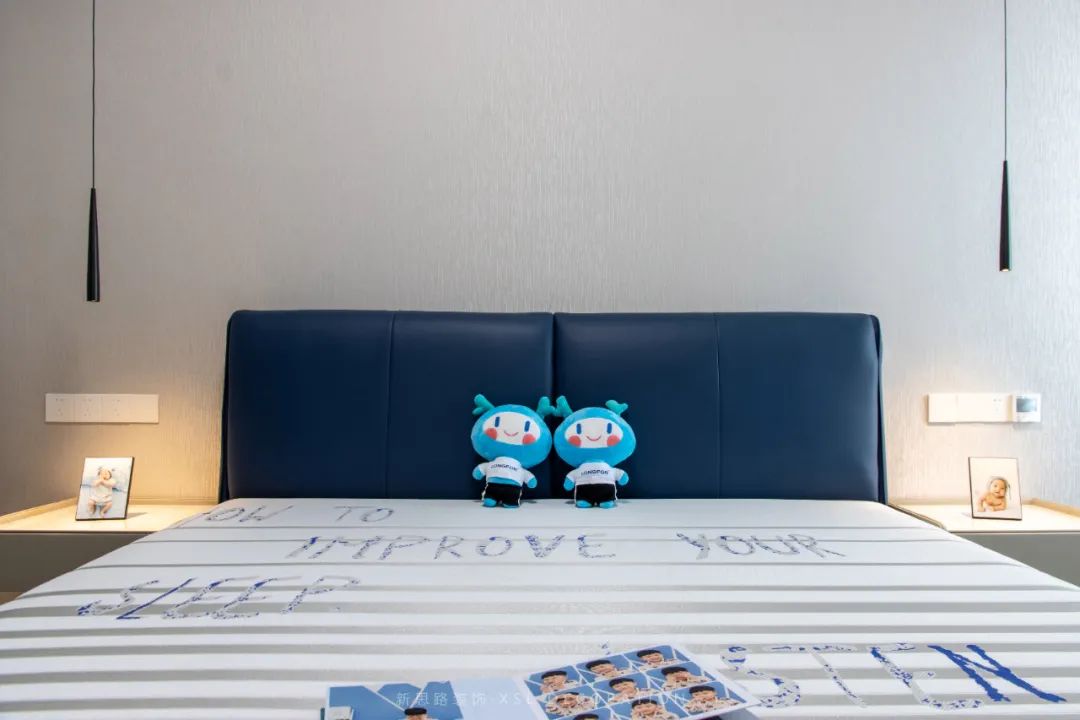 次臥作為青少年的睡眠空間,考慮到年齡的增長,所以延續(xù)簡約舒適的色調(diào)。深藍(lán)色床頭點(diǎn)綴形成設(shè)計美感,床頭柜與衣柜相結(jié)合增加層板的設(shè)計,可以滿足常用書籍或裝飾擺件的拿取,看似簡單卻使空間實(shí)現(xiàn)了的功能效。