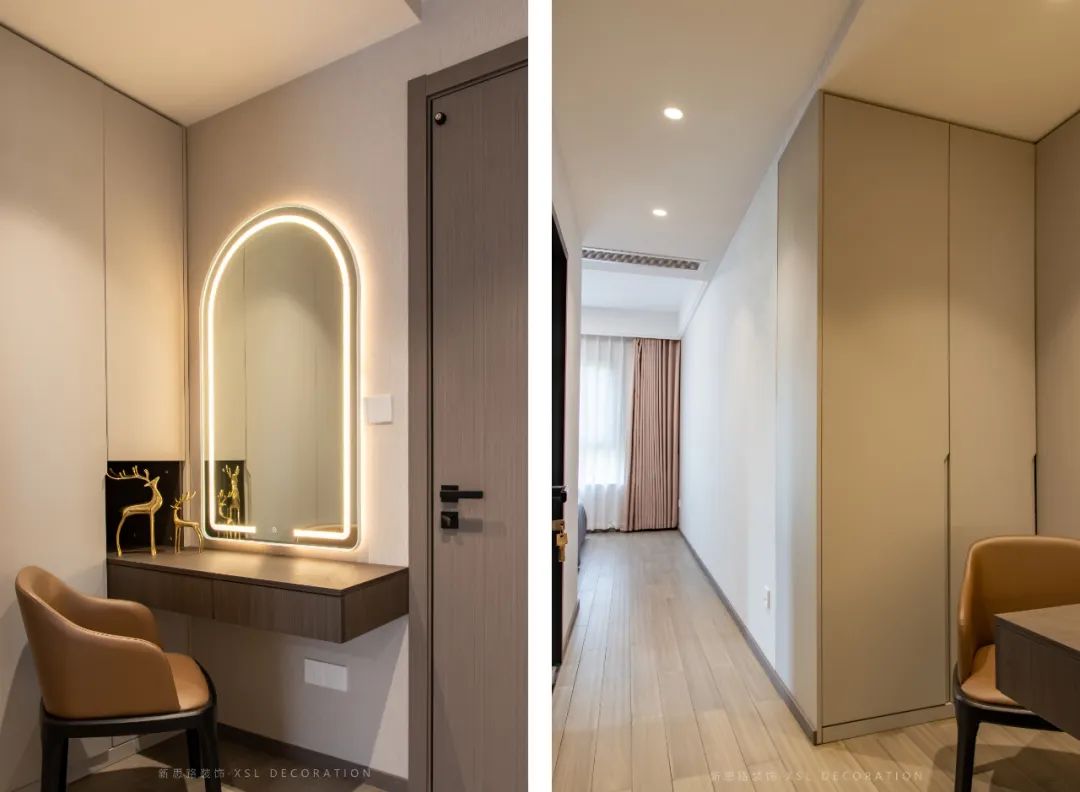 省略浮華的堆砌手法,僅用純粹的空間敘事,重塑空間的多元功能,將一門到頂?shù)模O(shè)計形式安排妥當(dāng),展現(xiàn)線紋的虛實(shí)感,補(bǔ)充便捷的收納性。