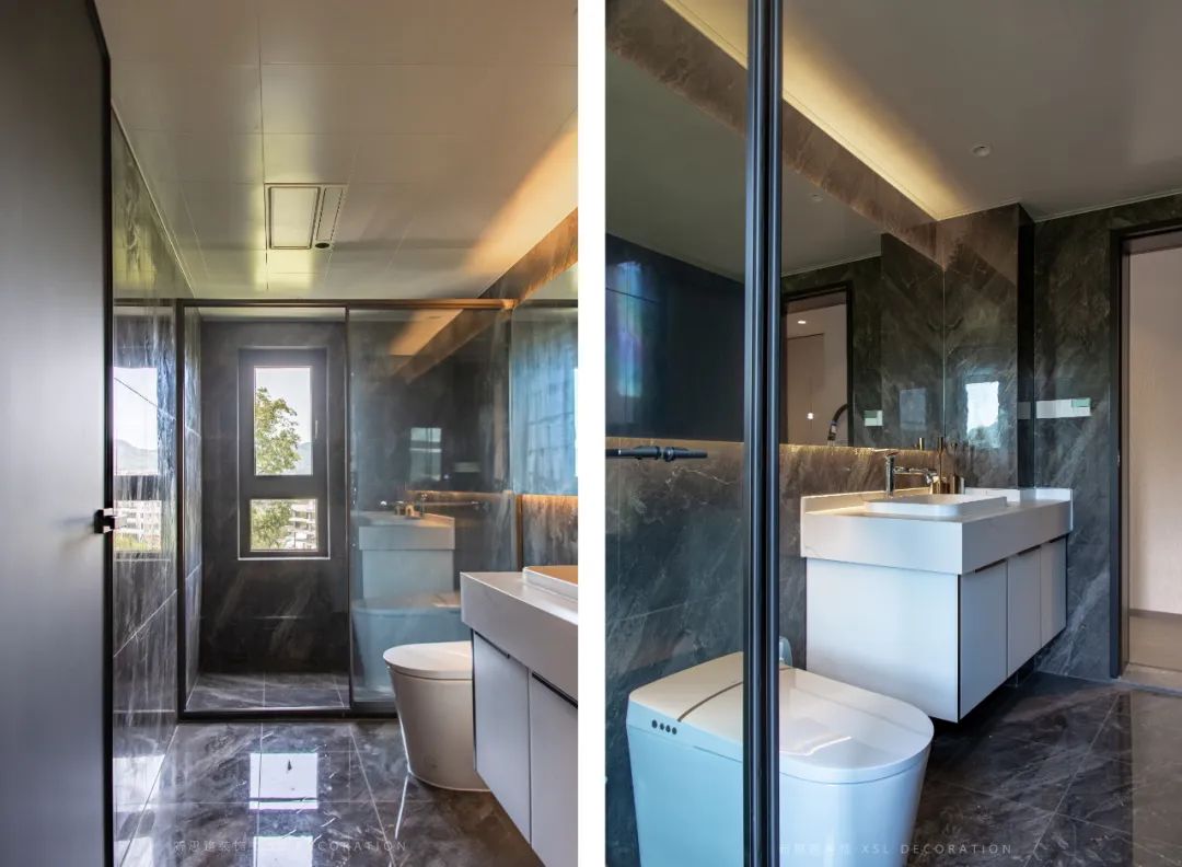 衛(wèi)生間整體采用深色系打造,配以淺色臺面,整體簡潔、大氣、有品位。干濕分離的設(shè)計很好地隔絕了水汽的侵蝕,保證衛(wèi)生間的清潔,易于打掃。