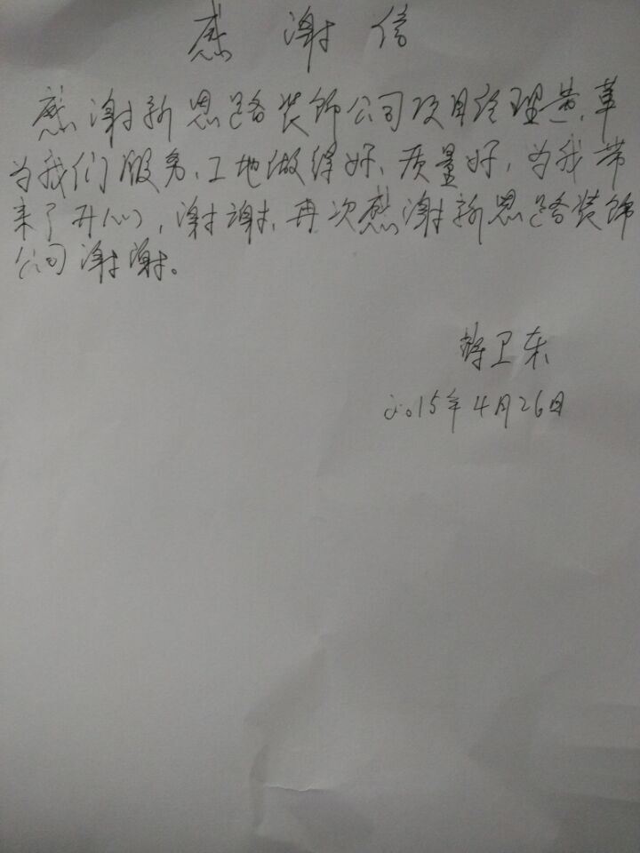 在信中,蔣老師表達了對新思路裝飾和黃工長的感謝之情:“感謝新思路裝飾公司,也感謝黃工長,工地做得好,服務好,為我?guī)砹碎_心,再次謝謝”!