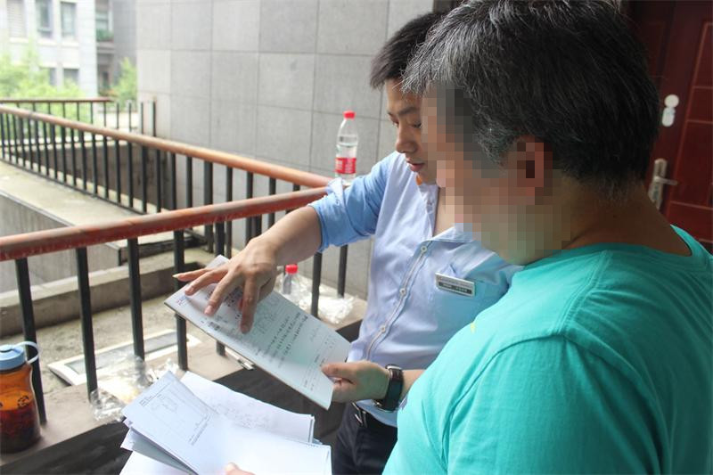 工程質檢正在認真填寫客戶服務手冊,以確認本次進場交底符合公司工程施工管理的相關規(guī)定。