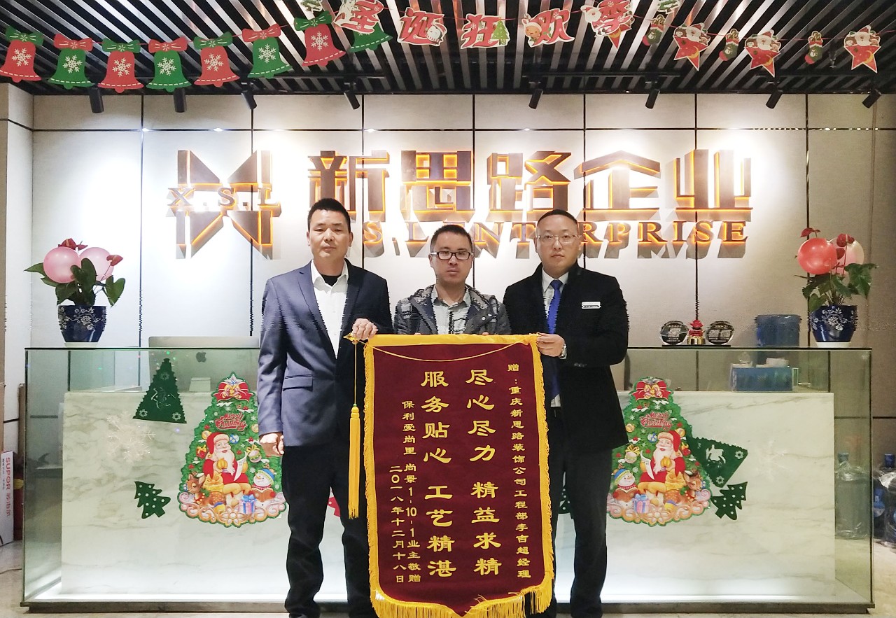2018年12月24日下午,來自保利愛尚里·尚景的業主鐘老師專程來到南坪總部,將一面印有“盡心盡力,精益求精,服務貼心,工藝精湛”的錦旗交給我們的項目經理李經理手中,以感謝新思路裝飾高品質工藝和優質貼心的家裝服務。