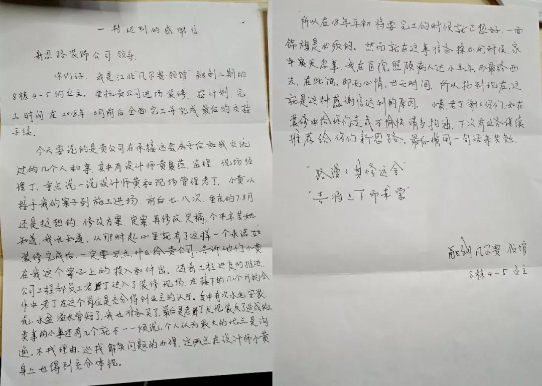 張老師說:“其實(shí)這個面錦旗和感謝信在2018年年初的時候都寫好了,過了大半年才送過來,也是因?yàn)橐恍┦虑椋袁F(xiàn)在才送來。主要是想感謝設(shè)計師小黃和項(xiàng)目經(jīng)理老丁,小黃從接手我的案子到施工進(jìn)場,忙前忙后,修改方案、定案、再修改定稿,特別是7、8月份的重慶天氣那么炎熱,這其中的辛苦,我也是知道的,就特別感謝小黃對我這個案子的投入與付出。還有項(xiàng)目經(jīng)理老丁在這個崗位是充分得到了我的認(rèn)可。個人認(rèn)為最大的優(yōu)點(diǎn)是溝通、不找理由和及時解決問題的態(tài)度,讓我特別滿意,下次有業(yè)務(wù)繼續(xù)推薦給你們新思路。”(張老師在去年工程完工后就把他朋友推薦給了我們,很感謝張老師的信任與認(rèn)可。)最后張老師借用了一句話來共勉:“路漫漫其修遠(yuǎn)兮,吾將上下而求索”。再次感謝張老師對我們新思路裝飾的認(rèn)可與信任。