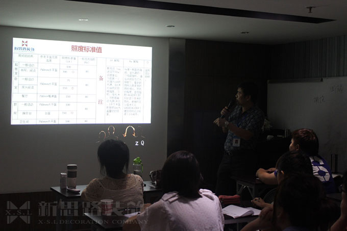張總通過現場投影儀,對主要設計目標、材料運用、照度標準值、家的空間、人體工程學、風水基本要素、功能空間設計等進行了詳細的闡述和講解。與會資深設計師還分享了各自的設計心得體會,講解了不同裝修風格中應該注重的細節,不可缺少的元素,設計與工藝的有效融合……張總和設計師們精彩、風趣的演講,讓培訓現場不時傳出陣陣掌聲與歡笑。