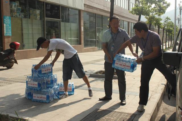 張總親自將礦泉水送到工人手中