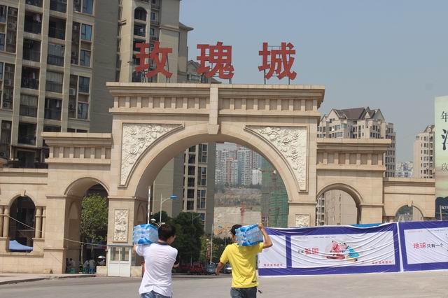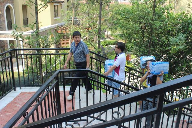 張總及慰問小組一行扛起水向東方雅郡小區施工工地進發送水