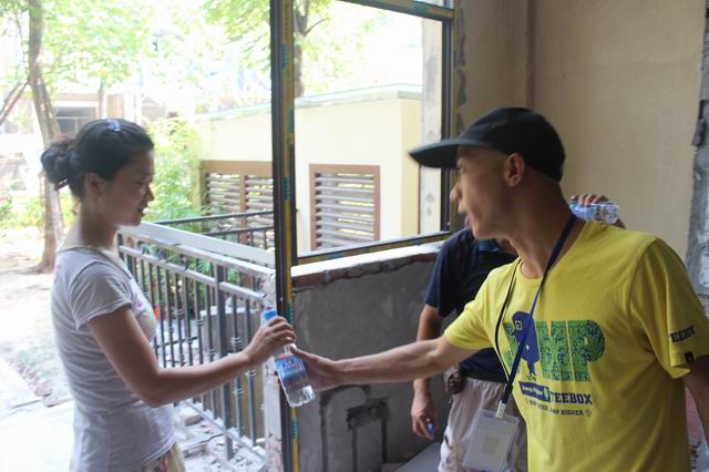 工程質檢親自將礦泉水送到工人師傅手中