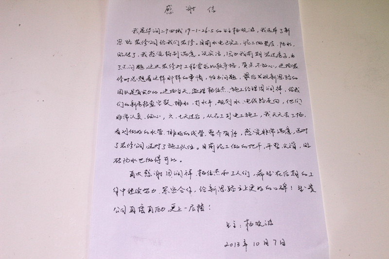 堅持客戶口碑第一:業主喜送感謝信