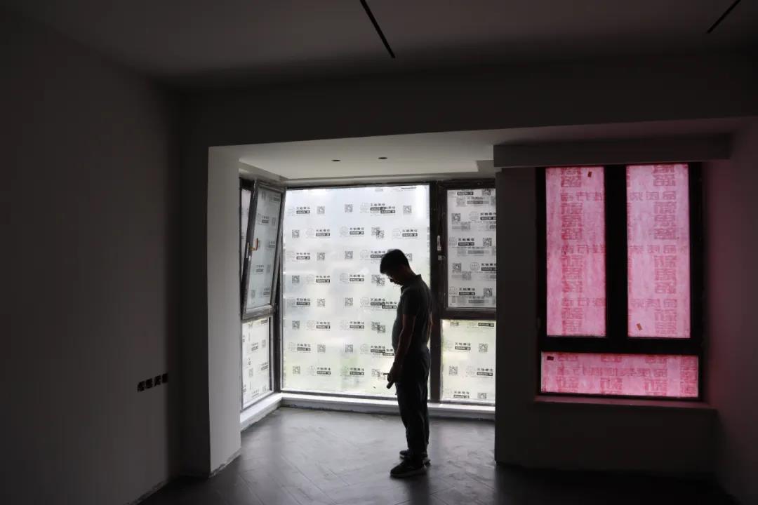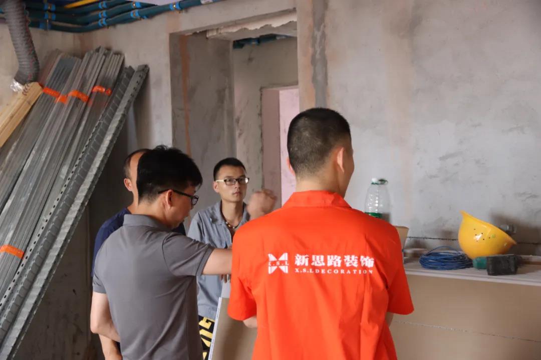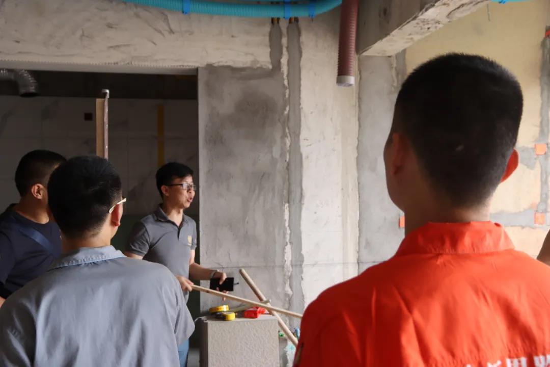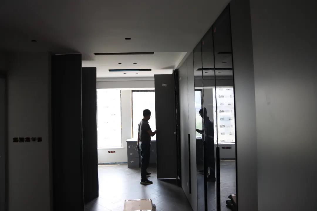 我們來到的第一處工地是水電階段剛結(jié)束、正在進(jìn)行硬裝階段的工地??蛻粽诠さ厣喜榭辞闆r,設(shè)計師敖元壩剛到現(xiàn)場,就和我們在施工的工人以及在場的客戶交流起來。