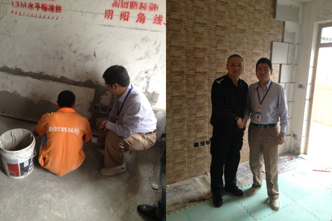 接著我們又細致的查看了工地現場,在經過公司工藝工程升級培訓之后,工地質量、施工隊伍的素質也得到了明顯提高。工地現場規范整潔,施工垃圾也分類歸放,工人施工技術更加熟練專業,在很多工藝細節上,均采用新技術解決了工程施工中遇到的難題。