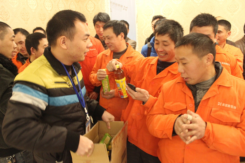 質檢正在給工人師傅們發放飲品,這體現了新思路以人為本的企業文化